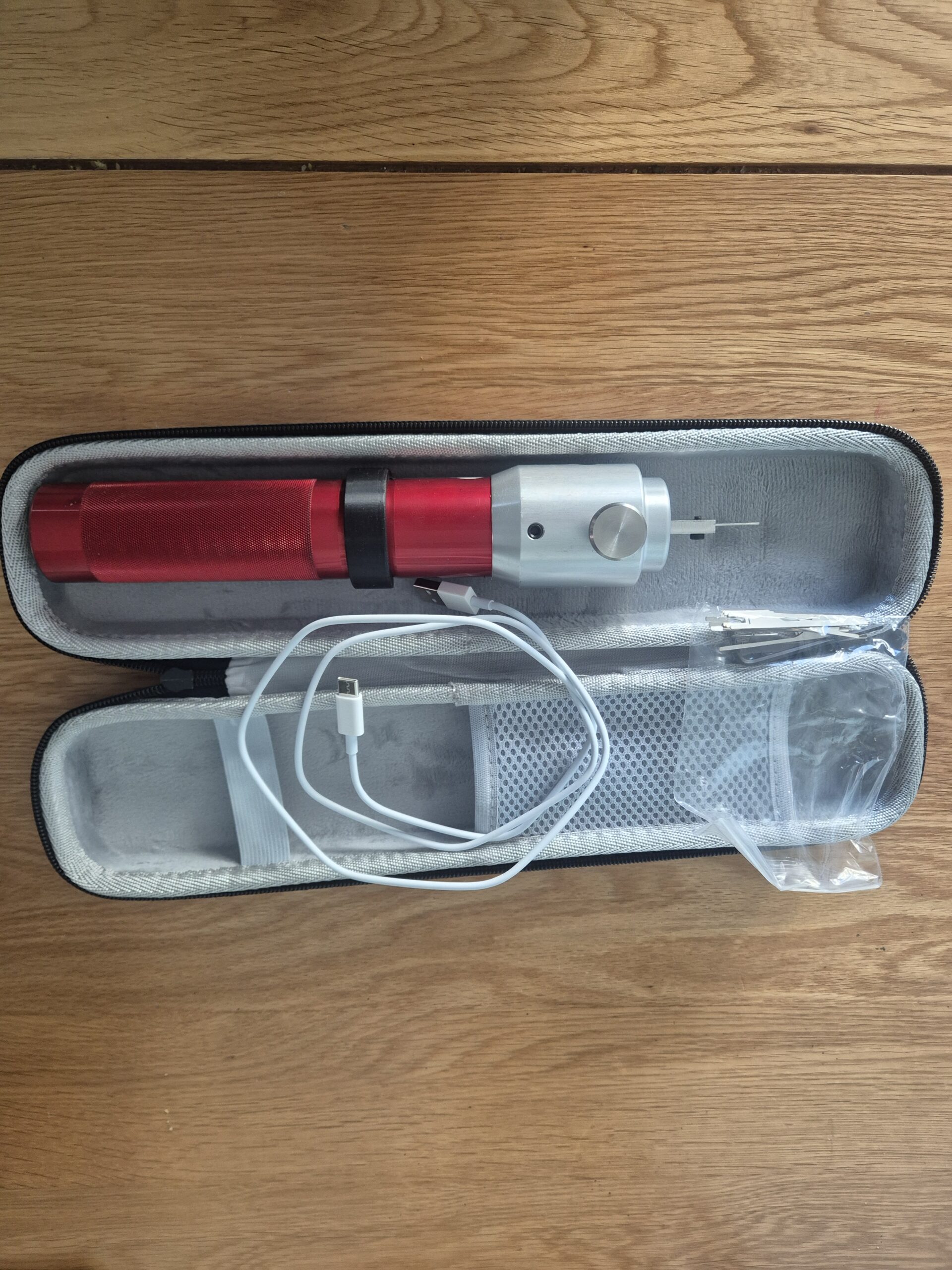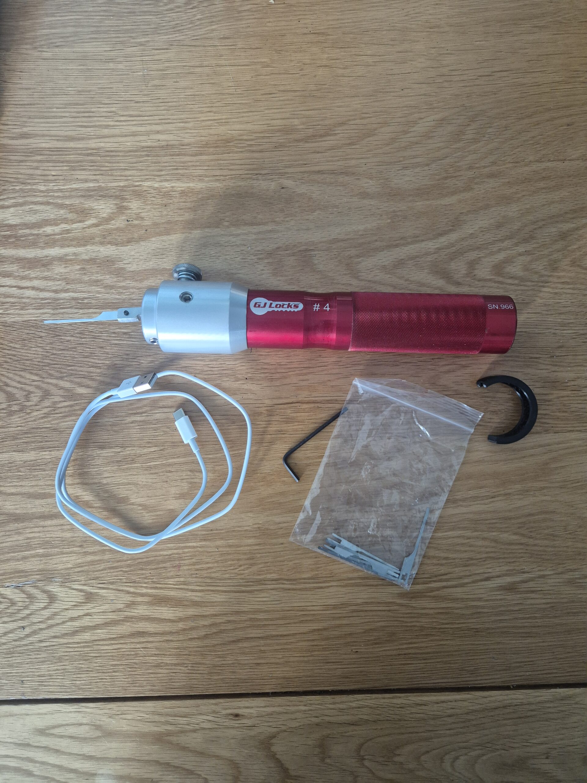 GJ EPG MK4 on oak table with charging cable, lock pick blades and collar.